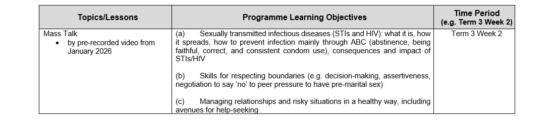 At Victoria Junior College, the following Sexuality Education lessons will be taught in 2026: